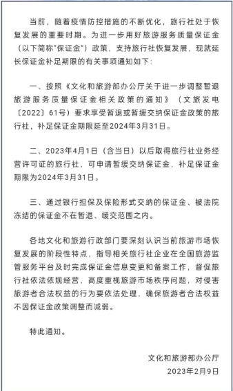 為進一步用好旅游服務質(zhì)量保證金(以下簡稱“保證金”)政策,支持旅行社恢復發(fā)展,文化和旅游部2月9日發(fā)布通知,延長保證金補足期限,要求享受暫退或暫緩交納保證金政策的旅行社,補足保證金期限延至2024年3月31日。2023年4月1日(含當日)以后取得旅行社業(yè)務經(jīng)營許可證的旅行社,可申請暫緩交納保證金,補足保證金期限為2024年3月31日。通過銀行擔保及保險形式交納的保證金、被法院凍結(jié)的保證金不在暫退、緩交范圍之內(nèi)。