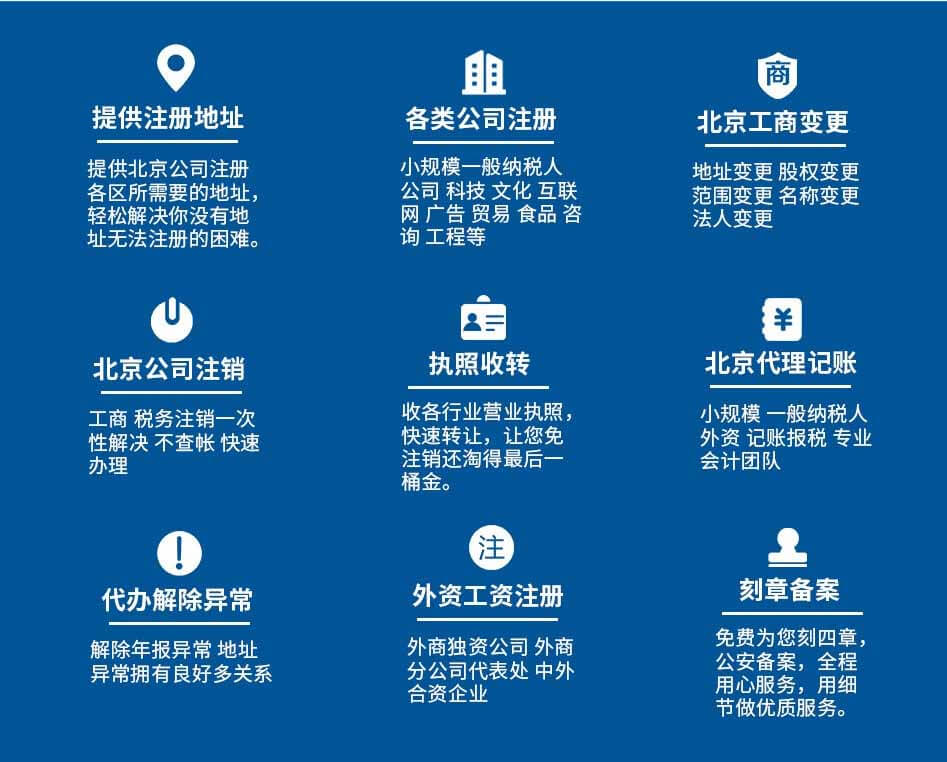北京注冊公司流程及費(fèi)用我都整理好啦!代辦個體公司營業(yè)執(zhí)照辦理,提供北京公司注冊地址,正規(guī)公司注冊代辦代理記賬公司,公司變更,股權(quán)變更,公司注銷轉(zhuǎn)讓一站式優(yōu)質(zhì)服務(wù)。