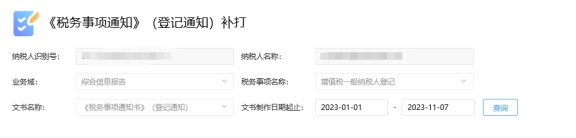 三、《稅務(wù)事項(xiàng)通知》(登記通知)補(bǔ)打界面,文書制作日期起:選擇一般納稅人生效年份的1月1日,文書制作日期止:選擇生效日期同年的12月31號(hào)(例:一般納稅人有效期起是2020-6-1,文書制作日期起是2020-1-1,文書制作日期止是2020-12-31)。