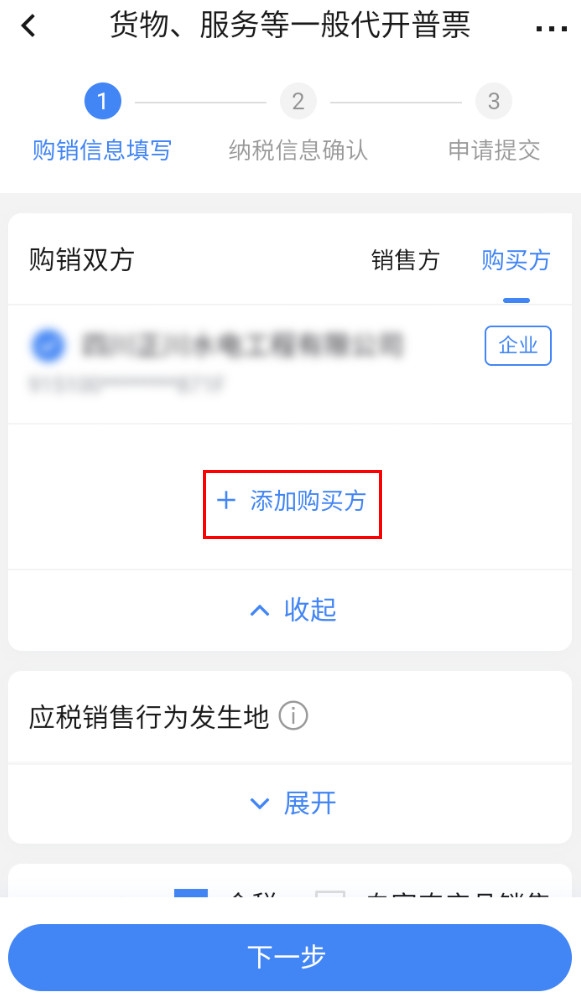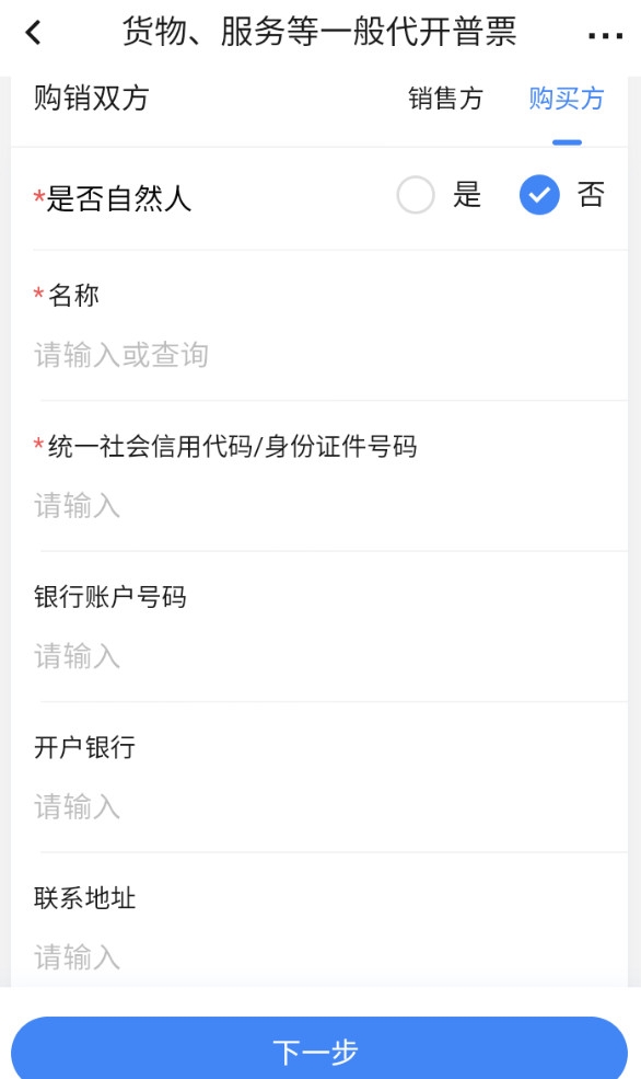 2.3、點擊“添加購買方”,選擇是否為自然人,錄入購買方信息:名稱、統(tǒng)一社會信息代碼/身份證件號碼、銀行賬戶號碼、開戶銀行、聯(lián)系地址、聯(lián)系電話、選擇是否展示銀行信息,點擊【保存】。名稱項為必填,其他項為選填。