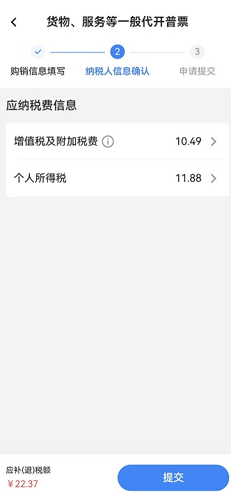 2.7、納稅信息確認(rèn):系統(tǒng)根據(jù)填寫的發(fā)票信息自動加載應(yīng)納稅款信息,納稅人確認(rèn)無誤后點擊【提交】。