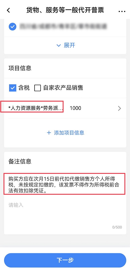 貨物、服務(wù)等一般代開普票時,若個人所得稅品目為勞務(wù)報酬、稿酬、特許權(quán)使用費所得時,納稅人信息確認(rèn)界面溫馨提示:本次代開申請個人所得稅項目為勞務(wù)報酬、稿酬、特許權(quán)使用費所得時,由購買方次月15日內(nèi)代扣代繳,如存在異議,請前往稅務(wù)大廳辦理。若為其他個人所得稅品目不顯示溫馨提示。