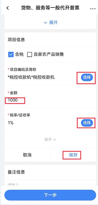 2.5、點擊“添加項目信息”錄入選擇項目編碼及簡稱、錄入金額,選擇稅率,點擊【保存】。