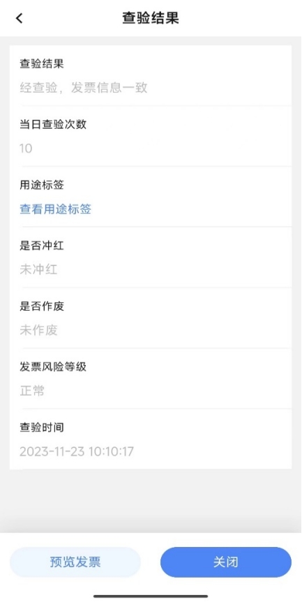 查驗(yàn)本人發(fā)票,且結(jié)果一致時(shí),反饋查驗(yàn)結(jié)果“經(jīng)查驗(yàn),發(fā)票信息一致”,同時(shí)展示發(fā)票票面信息、發(fā)票標(biāo)簽信息(包括發(fā)票用途標(biāo)簽及紅字發(fā)票標(biāo)簽等)及發(fā)票查驗(yàn)時(shí)間等信息;點(diǎn)擊【預(yù)覽發(fā)票】可以預(yù)覽發(fā)票的票面。查詢結(jié)果不一致的,反饋結(jié)果“經(jīng)查驗(yàn),發(fā)票信息不一致”,查驗(yàn)結(jié)果為不一致時(shí)不可預(yù)覽發(fā)票。若未查到該發(fā)票信息,反饋結(jié)果為“未查詢到該發(fā)票信息”。