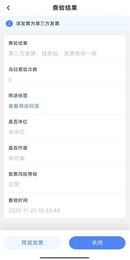 查驗(yàn)第三方發(fā)票時(shí),查驗(yàn)結(jié)果一致的反饋提示“第三方發(fā)票,經(jīng)查驗(yàn),發(fā)票信息一致”,查驗(yàn)結(jié)果一致時(shí)可點(diǎn)擊【預(yù)覽發(fā)票】查看發(fā)票票面信息;結(jié)果不一致的反饋提示“第三方發(fā)票,經(jīng)查驗(yàn),發(fā)票信息不一致”,查驗(yàn)結(jié)果不一致時(shí)不可預(yù)覽發(fā)票;若未查到,系統(tǒng)反饋“第三方發(fā)票,未查詢到該發(fā)票信息”。