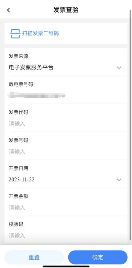 進(jìn)入“發(fā)票查驗(yàn)”頁(yè)面,可通過(guò)掃描已開(kāi)具發(fā)票的票面二維碼帶出相關(guān)信息,也可在頁(yè)面手動(dòng)錄入發(fā)票相關(guān)信息后點(diǎn)擊【確定】按鈕;若為本人發(fā)票,則只錄入發(fā)票號(hào)碼就可以查驗(yàn),若為第三方發(fā)票,則提示填入開(kāi)票日期及開(kāi)票金額(含稅金額)后進(jìn)行查驗(yàn)。