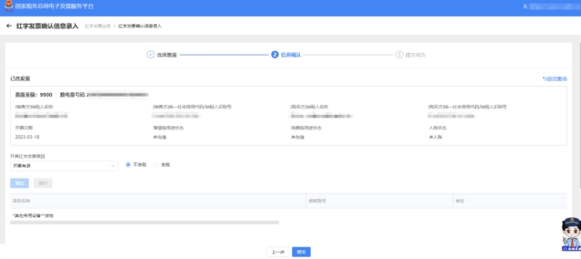 3.查詢到需要紅沖的藍字發(fā)票后,點擊右側對應的“選擇”按鈕,進入“②信息確認”頁面,需要沖紅的藍字發(fā)票信息會自動帶入。