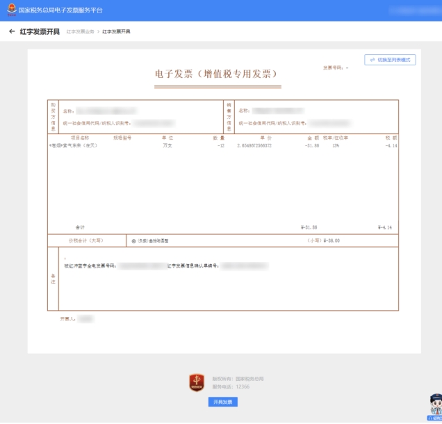 2.點擊【去開票】,進入紅字發(fā)票開具頁面核對發(fā)票信息,也可切換到票面模式預覽。