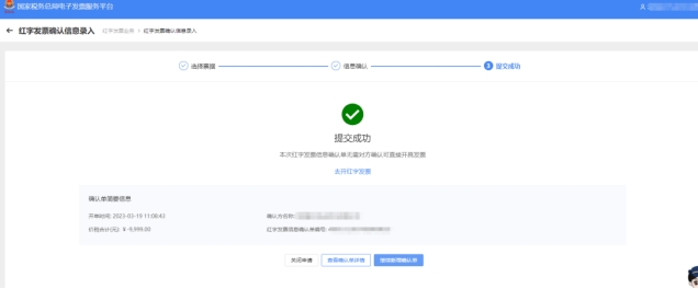 4.點擊頁面下方的“提交”按鈕,跳轉到“③提交成功”界面,提示紅字發(fā)票信息確認單提交成功。若銷方開具藍字發(fā)票后,藍字數(shù)電票的“增值稅用途標簽”為空、“消費稅用途標簽”為“未勾選庫存”、“入賬狀態(tài)標簽”為“未入賬”或“已入賬撤銷”的,由銷售方單獨發(fā)起紅沖,不需對方確認,在完成“紅字發(fā)票確認信息錄入”后,點擊“去開紅字發(fā)票”可直接開具紅票。