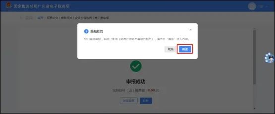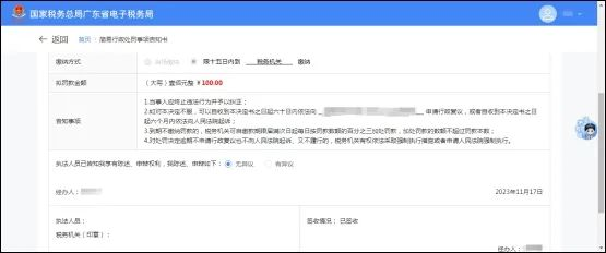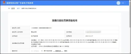 納稅人進行逾期申報后,系統(tǒng)校驗是否已完成所有逾期申報,如已完成且系統(tǒng)判斷不符合首違不罰的,則生成《簡易行政處罰事項告知書》,點擊“確定”可進入。