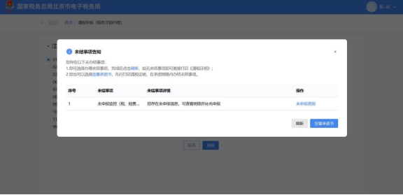 ?、倌蛇x擇辦理未結(jié)事項(xiàng),完成后點(diǎn)擊刷新,如無(wú)未結(jié)事項(xiàng)即可直接打印《清稅證明》; ②您也可以選擇簽署承諾書(shū),先行打印清稅證明,在承諾期限內(nèi)辦結(jié)未結(jié)事項(xiàng)。納稅人采用承諾注銷打印清稅證明后,未辦結(jié)事項(xiàng)可以通過(guò)登錄電子稅務(wù)局進(jìn)入該功能“未辦結(jié)事項(xiàng)告知”辦理。