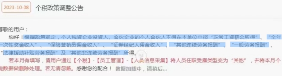 除了上文說到的個人所得稅不能長期零申報外,還有人收到了個稅調(diào)整公告:“根據(jù)政策規(guī)定,個人獨(dú)資企業(yè)投資人、合伙企業(yè)的個人合伙人不得在本單位申報"正常工資薪金所得”、"全次性獎金收入”“保險營銷員傭金收入”“證券經(jīng)紀(jì)人傭金收入”、“其他連續(xù)勞務(wù)報酬”、“一般勞務(wù)報酬”法律援助補(bǔ)貼勞務(wù)報酬”及“其他非連續(xù)勞務(wù)報酬”所得。