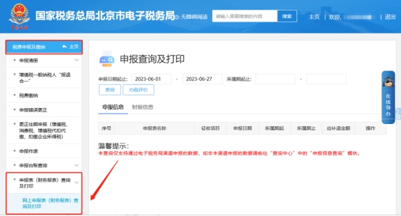 二、稅費申報及繳納—申報表(財務(wù)報表)查詢及打印—網(wǎng)上申報表(財務(wù)報表)查詢及打印模塊查詢更新后的報表信息即可。
