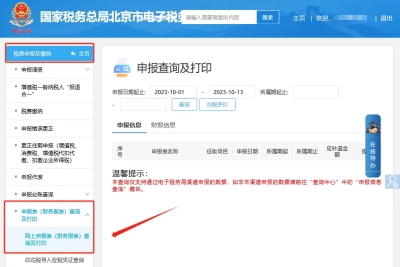 二、稅費申報及繳納—申報表(財務報表)查詢及打印—網(wǎng)上申報表(財務報表)查詢及打印,財報信息(若需要打印財務報表請務必要選擇“財報信息”)—選擇申報日期起止點擊“查詢”即可。